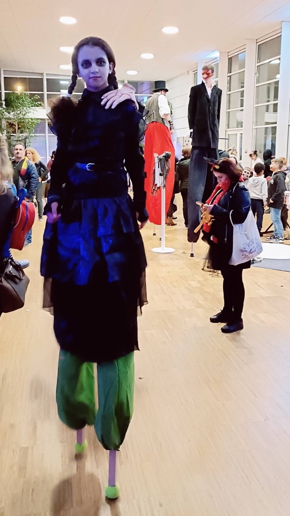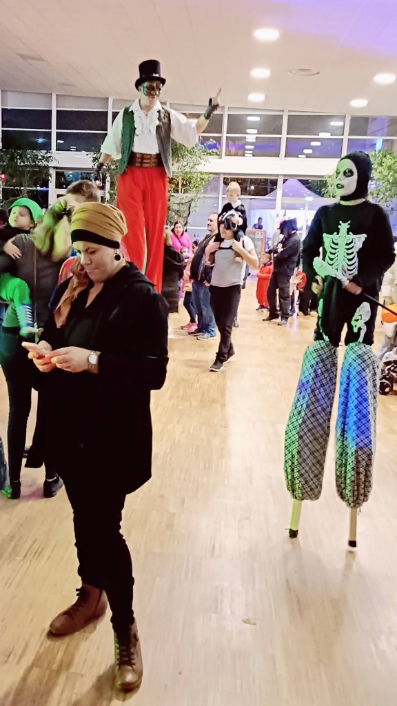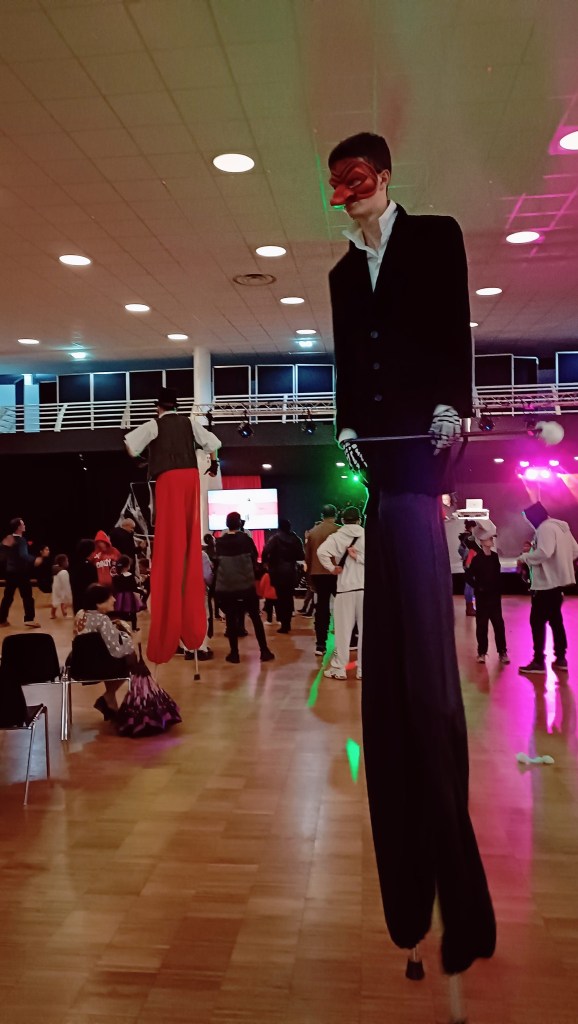 au Centre culturel avec plein de petits monstres sur la piste de danse : nos braves échassiers ont eu très peur de tous ces enfants horriblement déguisés.